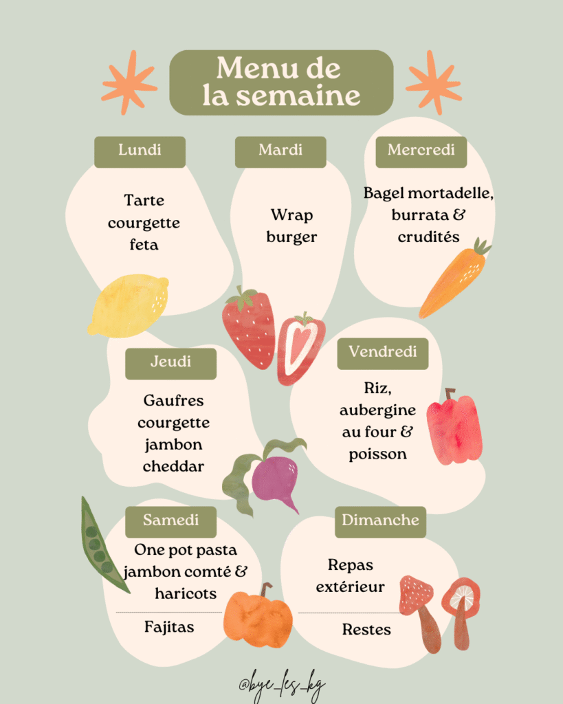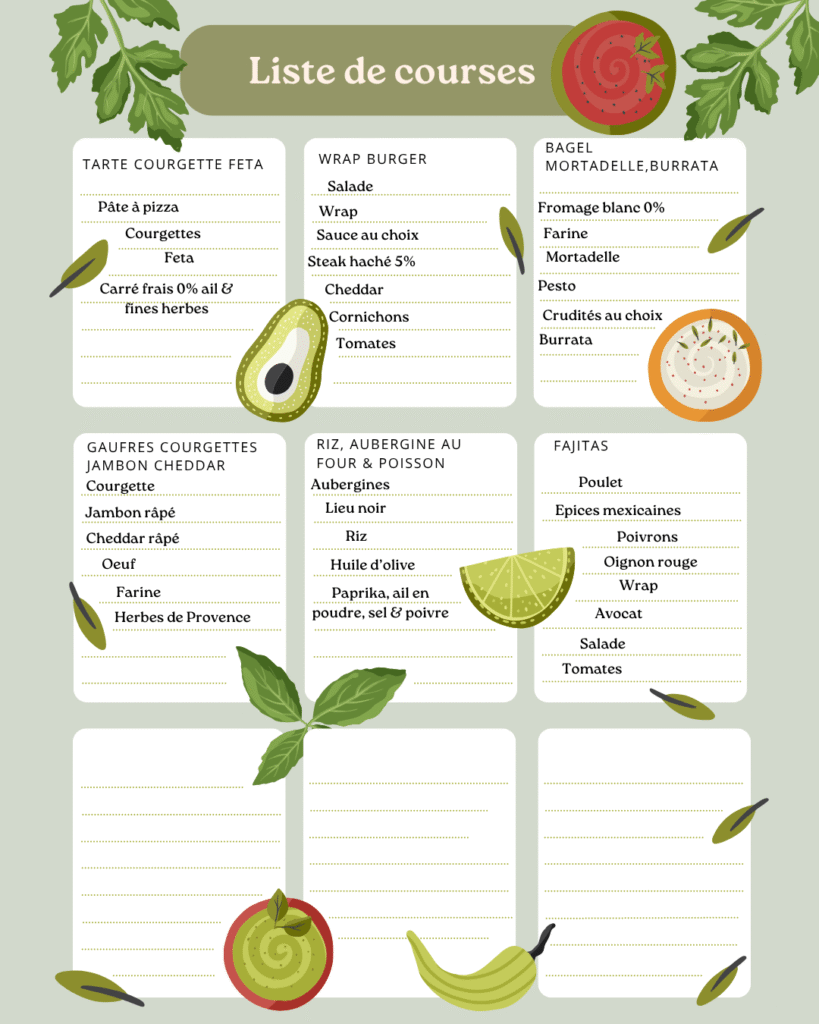 Cette semaine 31, on continue de se faire plaisir tout en mangeant sainement avec un menu qui sent bon l’été et la gourmandise ! À découvrir : une tarte courgette & feta légère et parfumée, parfaite pour un repas du soir, un bagel mortadelle & burrata ultra gourmand mais équilibré, un plat complet riz, aubergines & poisson pour faire le plein de fibres et d’oméga-3, et un savoureux wrap façon burger, idéal pour satisfaire les envies de fast-food version healthy.