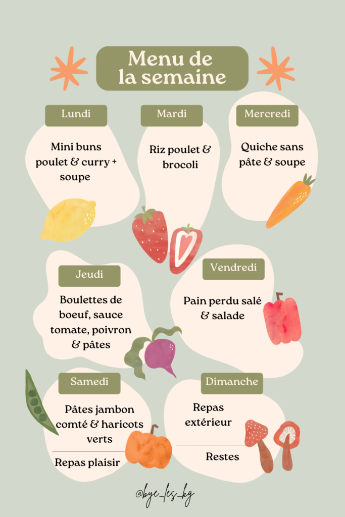 Dimanche : on profite d’un repas extérieur en famille et le soir, on finit les restes pour une transition douce vers la semaine suivante.